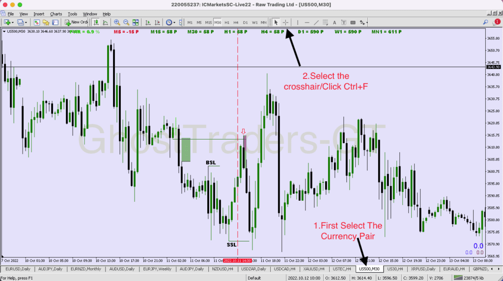 You can calculate the number of pips in MetaTrader 4 by using the crosshair. by default, MetaTrader 4 will be on the cursor therefore you will have to switch by navigating to the crosshair and clicking it then left-click and hold while moving your mouse from the entry-level to the exit level or from the entry-level to the stop loss to measure how much is your risk.