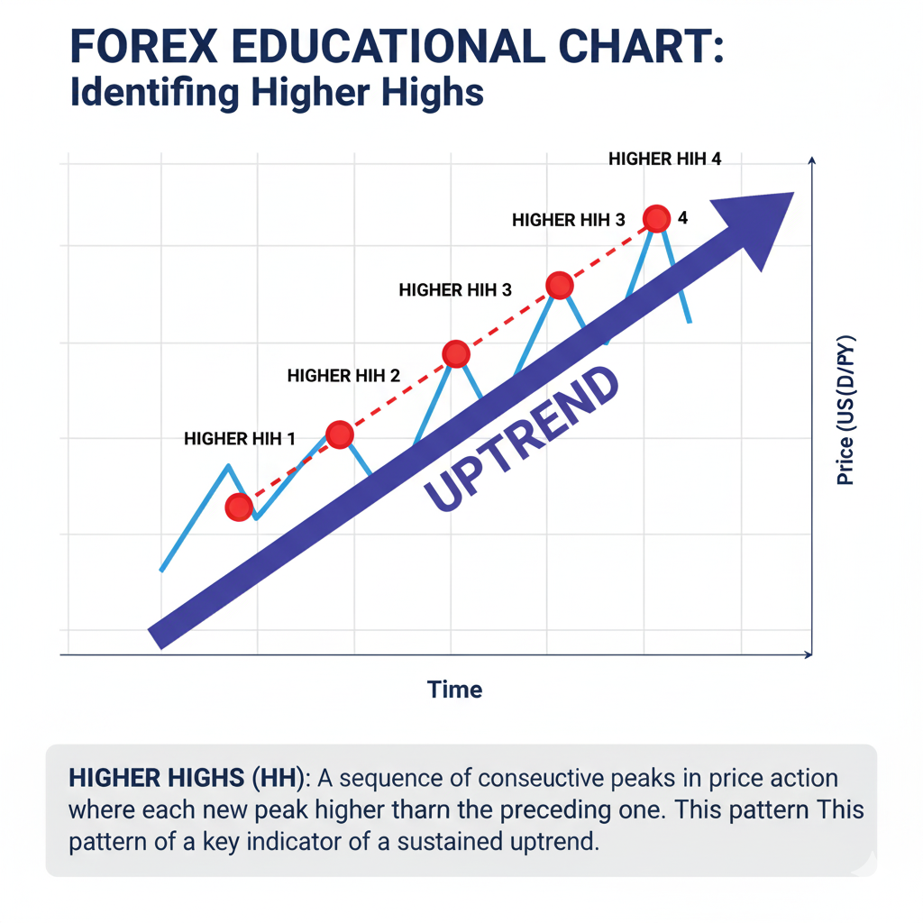 Imagine the EUR/USD pair rises to 1.0800, pulls back to 1.0700, then climbs again to 1.0850. The new peak at 1.0850 is a higher high compared to 1.0800, showing bullish strength.